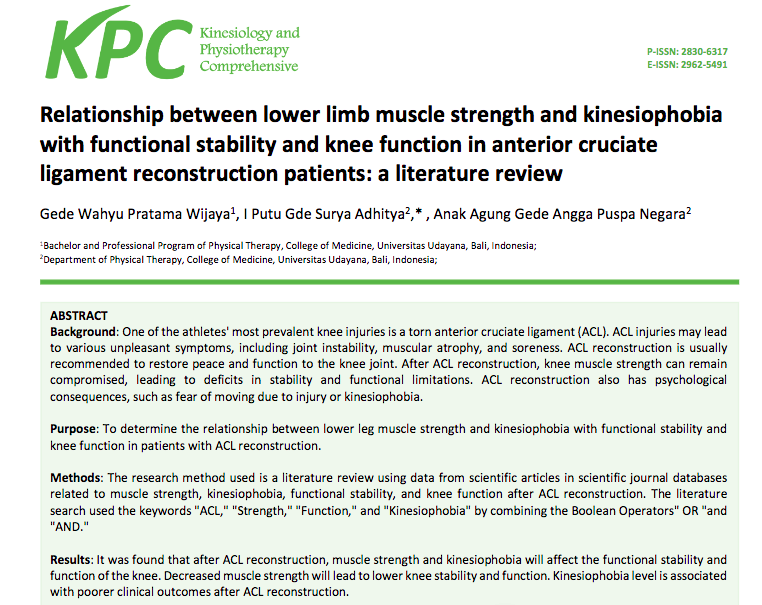 KPC merupakan jurnal ilmiah sebagai wadah mahasiswa dan dosen fisioterapi untuk mempublikasikan hasil karya ilmiahnya. KPC menerima artikel ilmiah dengan jenis original article, review, dan case report yang berkaiatan dengan ilmu kinesiologi dan fisioterapi. KPC berdedikasi untuk menjadi jurnal yang mandiri, transparan, dan berstandar internasional untuk turut mengembangkan keilmuan fisioterapi di Indonesia. Website jurnal kami adalah: kgft.web.id